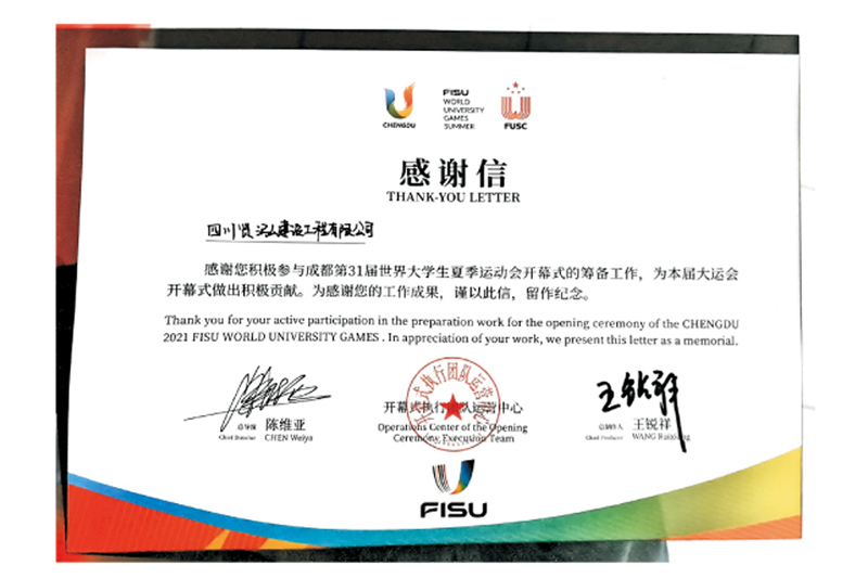 成都第31届世界大学生夏季运动会 荣誉纪念证书